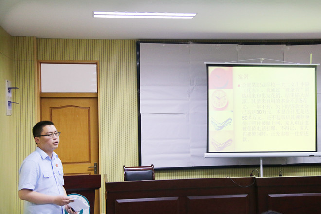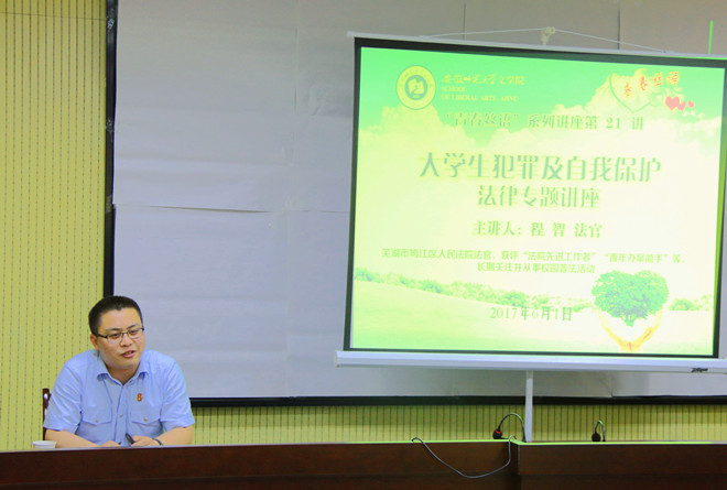 6月1日下午,必赢线路检测3003no1“青春丝语”系列讲座第二十一期在必赢线路检测3003no1行政楼三楼报告厅如期开讲。芜湖市鸠江区人民法院程智法官应邀为大家带来了题为“大学生犯罪及自我保护”法律专题讲座, 2015级辅导员孙霁雯、汪旭、何涛以及近百名学子到场聆听。
