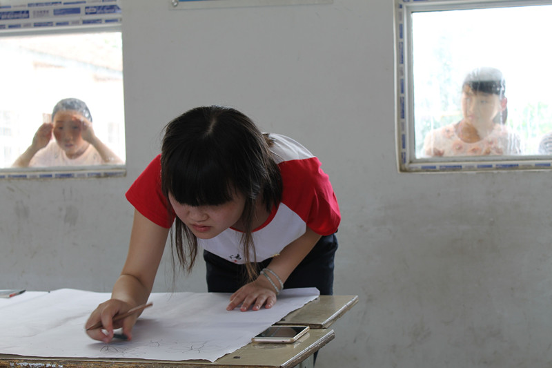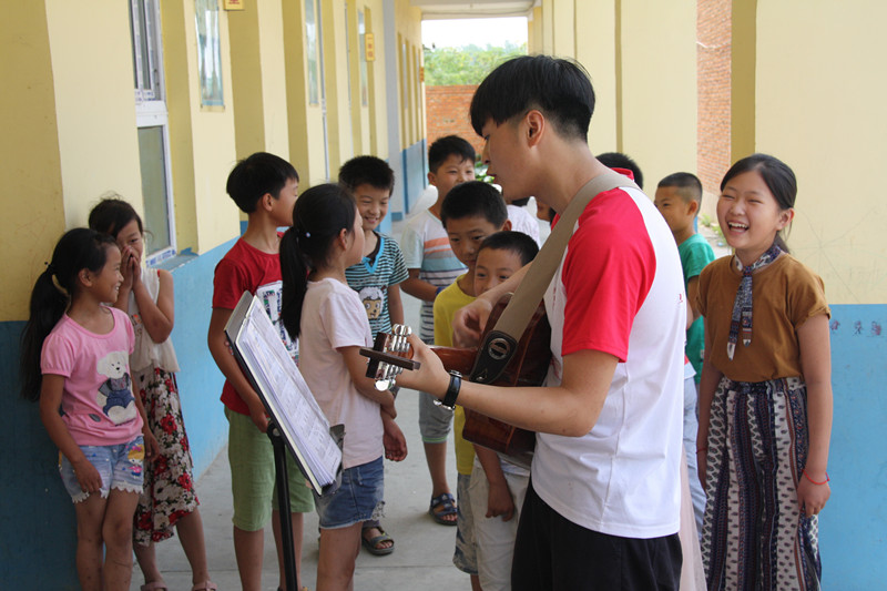 “老师们好。”一个长相清秀的小女孩朝志愿者们鞠了个躬,尊敬地向我们问好。对于我们这群大哥哥大姐姐的到来,孩子们是十分好奇与高兴的。有一个四年级同学拉住他的小伙伴,用略带惊奇的语气说:“老师们怎么都长这么高呀?”课表上排得满满的,尽是“语文”和“数学”,当志愿者问起孩子们最想上的课程时,孩子们不加掩饰地回答说是音乐、美术和体育。于是,团队成员吴长河支起了音箱和话筒,给孩子们弹唱了他们喜欢的歌曲。我们的小吴老师成了孩子们眼中的“大明星”。晌午的时候,志愿者们在教室里绘制海报,孩子们从窗外探出头来,“他们画的好好看啊!”圆溜溜的眼睛转了几转,尽是好奇与激动。