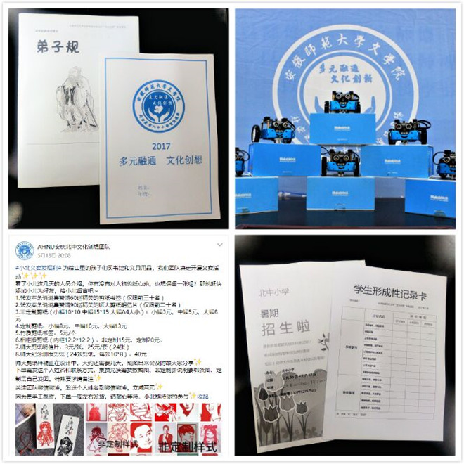 三月伊始的想法萌生,四月中旬的陆续准备,五月末尾的实地考察,如今六月义无反顾地翻山越岭。团队自主设计了队旗、队徽、队服以及学生成长记录卡、招生宣传海报等,16名队员通力合作,十余次增补删减,编写印刷包括茶道剪纸、科学实验和智力训练等十余万字的教案材料。团队队员积极联系科大讯飞旗下麦穗创客教育集团,接受专业技术培训,熟练掌握科技模型操作。此外,队员们还别出心裁地制定了全新形式的《弟子规》,在保留其原有内容的基础上“留白”,给孩子们留出空间发挥想象,用自己喜爱的任何形式表达对《弟子规》内容的理解与感悟。在临行前,团队开启线上“定制·印象”剪纸募捐活动,亲手为孩子们筹集资金购买文化读物、手工教具等。团队在谨守中国传统文化“正”的同时,致力突出时代特色之“新”,以“守正出新”方式讲述传统文化。