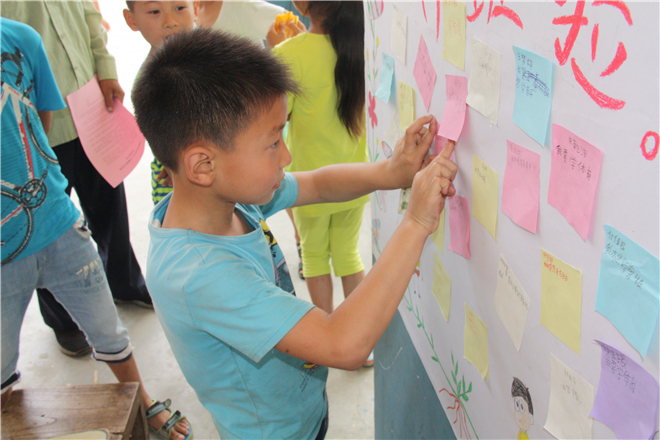 “我想跟着你们学习,每天都来。”“我的愿望是每次都考第一名。”“我想成为一名大科学家。”报名结束后,孩子们用稚嫩的笔画在彩色的卡片上写下自己的愿望,小心翼翼地贴在了心愿墙上,还有些不放心地用小手按了按。志愿者们拿来胶带帮孩子们固定,他们这才心满意足地转过身去,围着小吴老师要他唱歌来听。“老师,我来帮你扶着吧。”看到风吹起了小吴老师的琴谱,一个小男孩连忙跑上前去。