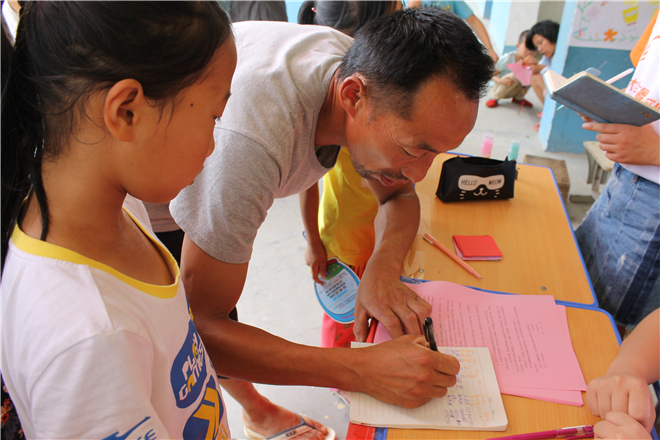 招生快要结束的时候,一位参加过对越自卫反击战的老兵走到了我们的招生台前。这位老兵是我们在走访附近村落时遇到的,原本打算明天再专程拜访,没想到他却亲自来到了学校。老人已经六十岁了,可是看上去却年轻很多,“你们愿意到这里来做好事,难能可贵啊!你们都是好青年。”老人朝我们竖起了大拇指。跟在他身后的孩子眼睛明亮清澈,规规矩矩地向我们问好。