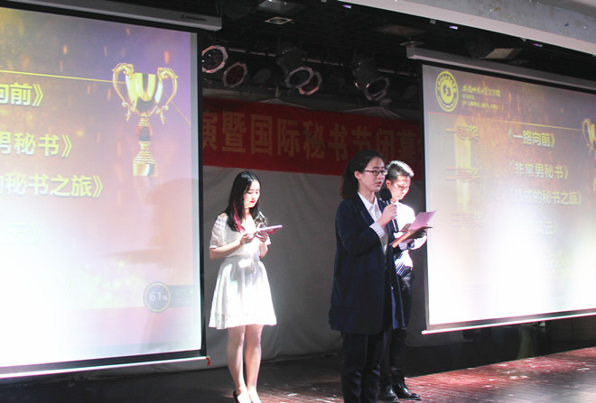 “青春的秘书人”风采展板、活动海报、礼仪接待、颁奖盛典投影大屏幕……伴随着慷慨激昂的音乐,受获奖学生迈着从容自信的步伐进场入座,同学们的热烈掌声拉开了此次情景剧汇演暨国际秘书节颁奖闭幕式的序幕。活动前,播放了视频短片《秘书的名义》,“回首向来处,始知前路长”,短片以回顾往届国际秘书节系列活动为主,播放同学们参与结构化面试的短片,展现了秘书学专业的发展建设历程,现场气氛感动而温馨。