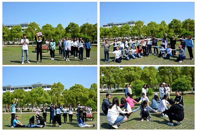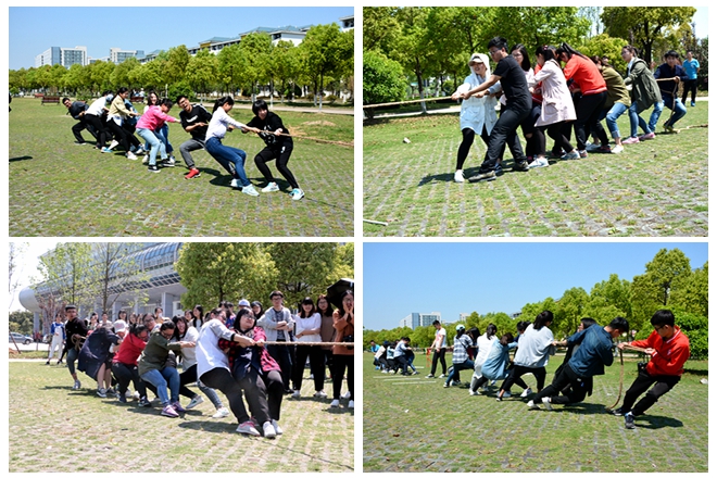 全体近200名学员分为十队,在班委们的带领下积极开展活动。首先各队进行包括队名、队徽、队旗、队形、队歌等在内的团队文化设计。“奔跑吧青春队”、“红星队”、“超能‘秘’战队”、“汉非什么都队”……大气幽默的队名、别出心裁的队形、高亢激昂的队歌,是大家融入到一起之后十分钟内群策群力的结果。游戏“坐地起身”环节,每个队内相互扶持,背靠背、手挽手站起来。“齐眉棍”环节,各队推选出的六名代表合作,每人用一只手指共同将棍子从与眉毛齐高处放到地上。拔河环节则是整个素质拓展活动的高潮,加油声、呐喊声、欢呼声,在明媚的春光里,沸腾了整个南体。游戏环节,每队精心挑选代表、严禁制定攻略,本着“友谊第一,比赛第二”的原则,在竞争中合作,在合作中成长。