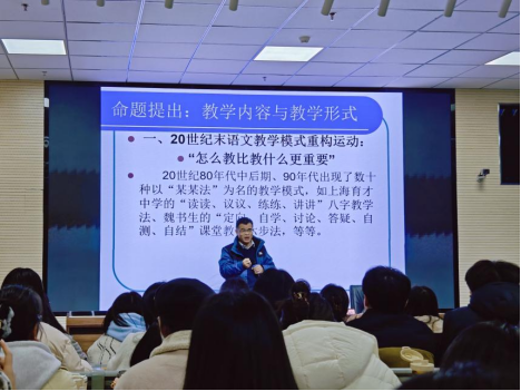 张心科教授围绕“精要的内容与适宜的形式”,提出不同学段、不同文体、不同教学内容,应采用不同的教学形式。张教授首先讨论了20世纪末语文教学内容重构运动中的“怎么教比教什么更重要”,和本世纪初语文教学内容重构运动中的“教什么比怎么教更重要”这两个观点,说明了在不同时代背景下教学内容与教学形式之间的关系是有所变化的。随后以《烛之武退秦师》中“秦晋围郑”的紧迫形式这一教学内容,通过运用三种不同的形式教学所达到的不同效果,让同学们认识到教学内容与教学形式之间的关系。