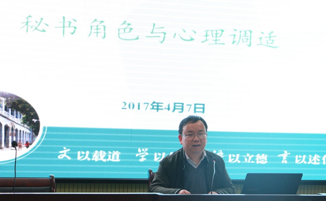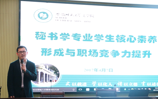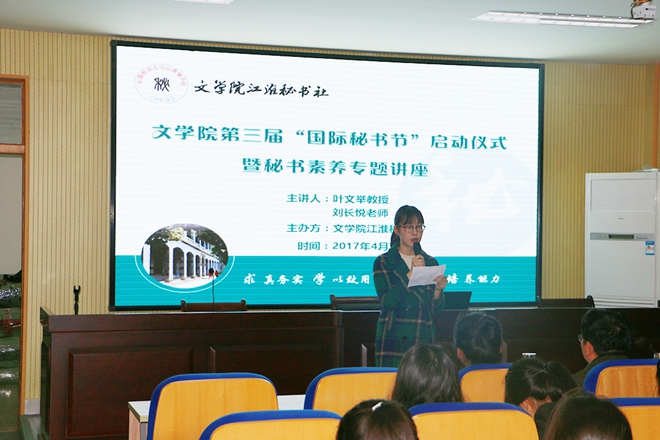 4月7日晚,必赢线路检测3003no1第三届“国际秘书节”启动仪式暨秘书素养专题讲座在必赢线路检测3003no1行政楼三楼报告厅如期举行。秘书学专业负责人叶文举教授、秘书学专业课教师刘长悦应邀为大家带来“秘书素养”专题讲座。秘书学专业辅导员周青松、何涛,实习辅导员高燕,2015级、2016级秘书学专业学生以及江淮秘书社成员共百余人到场聆听。江淮秘书社副社长王璐主持此次讲座。