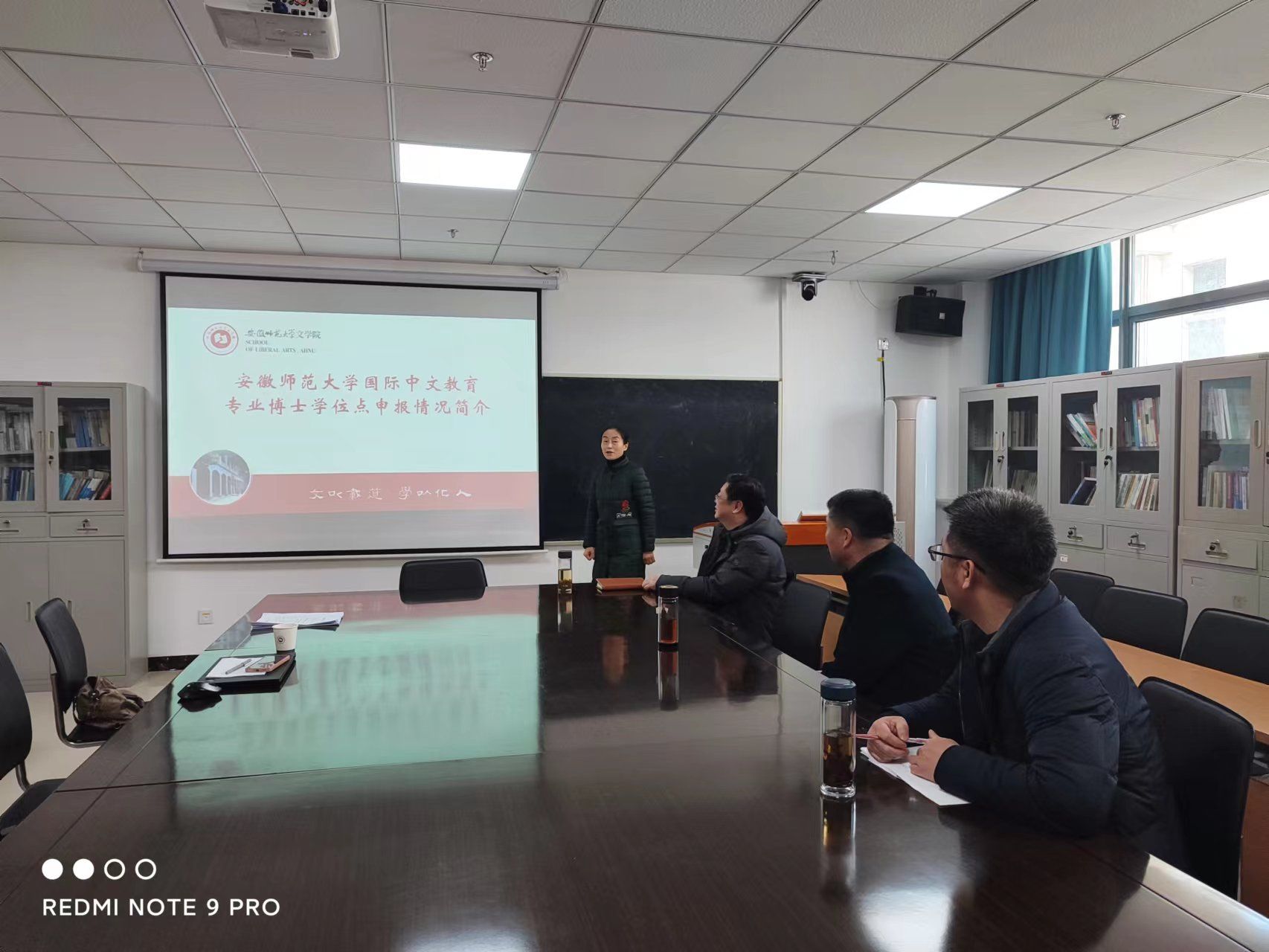 会上,汪红艳老师首先简要介绍了国际中文教育专业博士学位点申报情况。汪红艳老师根据我校现有资源整合情况,报告了国际中文教育专业博士学位点的培养方向和目标、专任教师和拟开设相关特色课程等情况。汪老师强调,我校国际中文教育专业博士培养拟以中文作为第二语言教学、汉外语言文化对比、中华优秀文化传播为主要方向,以培养能胜任国际中文教育、中华优秀文化传播、中外文化交流等工作的复合型、国际型、应用型专家级师资、教研核心骨干和高级管理人才为目标,坚持以服务国家、研究中国传统与中国影响、发出中国声音和讲好中国故事为需求导向。