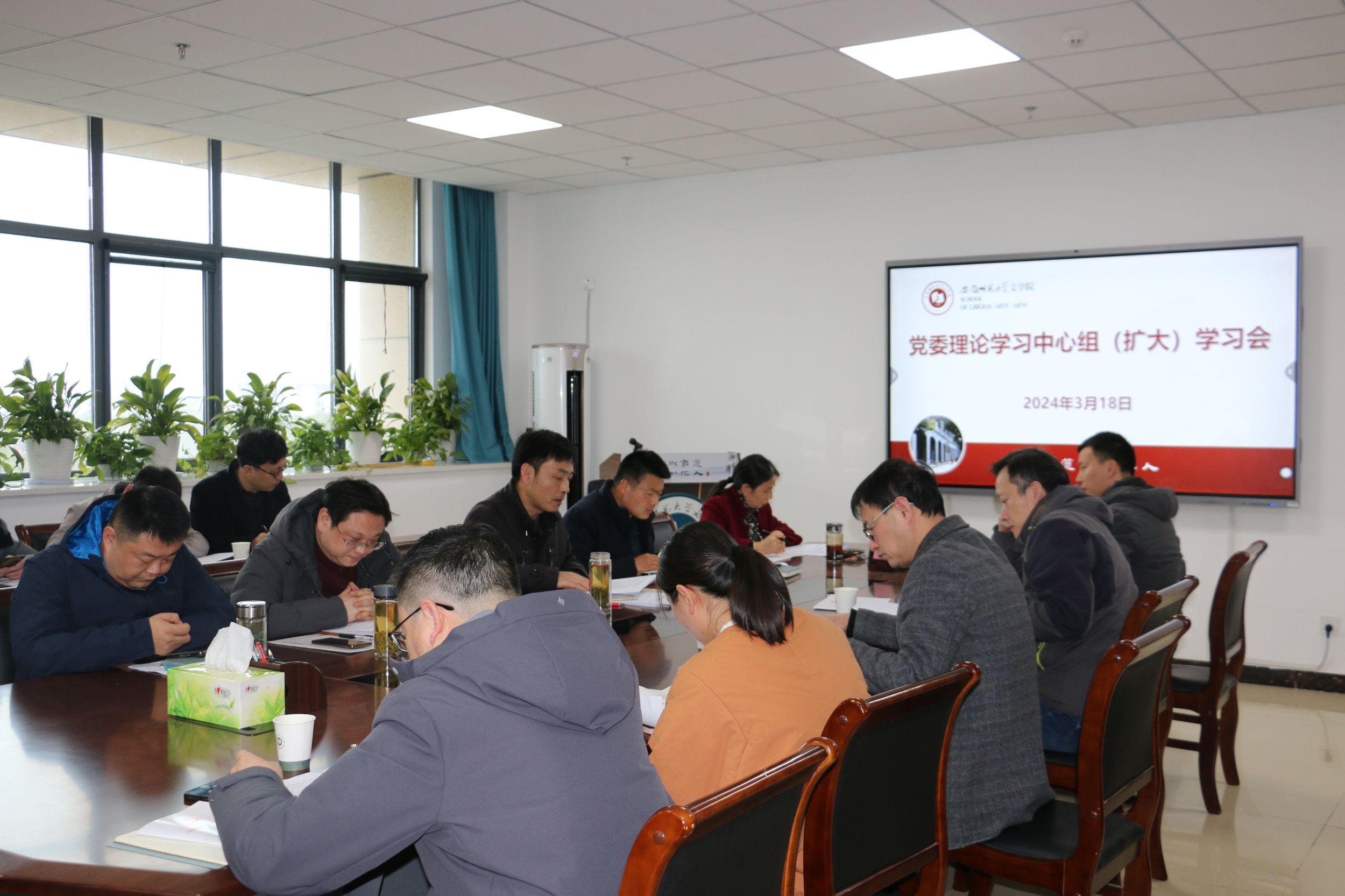3月18日下午,必赢线路检测3003no1召开党委理论学习中心组(扩大)学习会,专题学习习近平总书记在全国两会期间的重要讲话精神和全国两会精神,传达学校“新春第一会”精神。学院处级党员领导干部、党委委员、纪委委员、党支部书记、各科室秘书参加会议。会议由学院党委副书记(主持党委工作)戴和圣主持。
