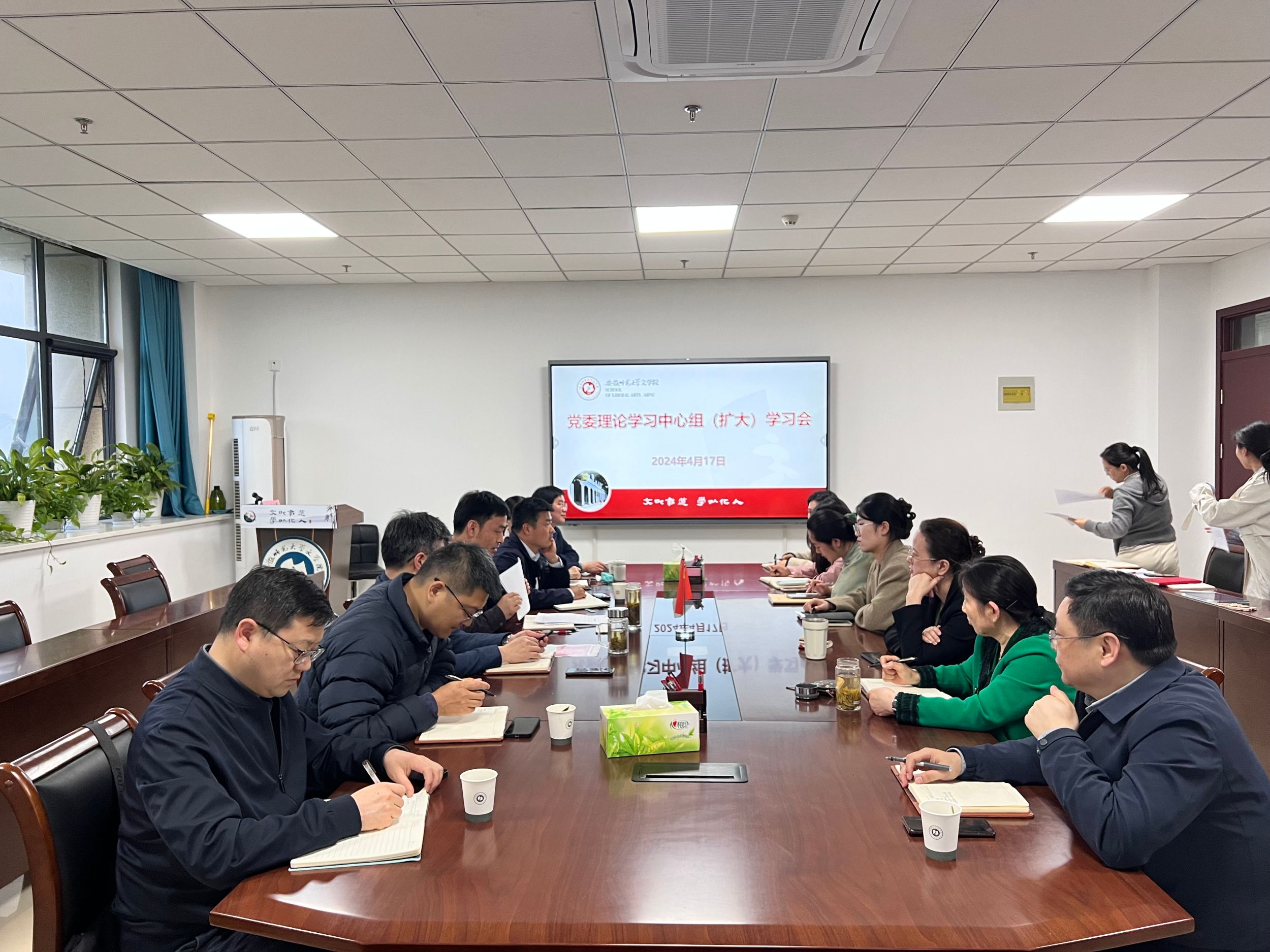 4月17日下午,必赢线路检测3003no1召开党委理论学习中心组(扩大)学习会议。学院党委委员、纪委委员、专业负责人、党支部书记、师生党员代表参加会议。会议由学院党委副书记(主持党委工作)戴和圣主持。