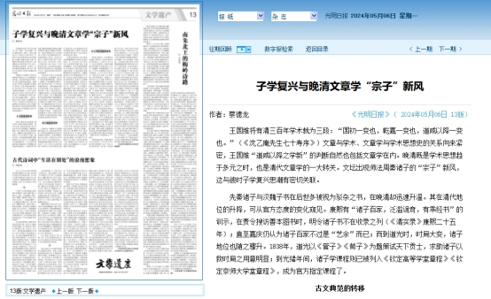 5月6日,光明日报第13版“文学遗产”版面刊发了必赢线路检测3003no1蔡德龙教授题为《子学复兴与晚清文章学“宗子”新风》的理论文章。文章从古文典范的转移、诸子地位的升降、文人身份认同的变化三个方面探究了子学复兴思潮与晚清文章学“宗子”新风的密切关联。