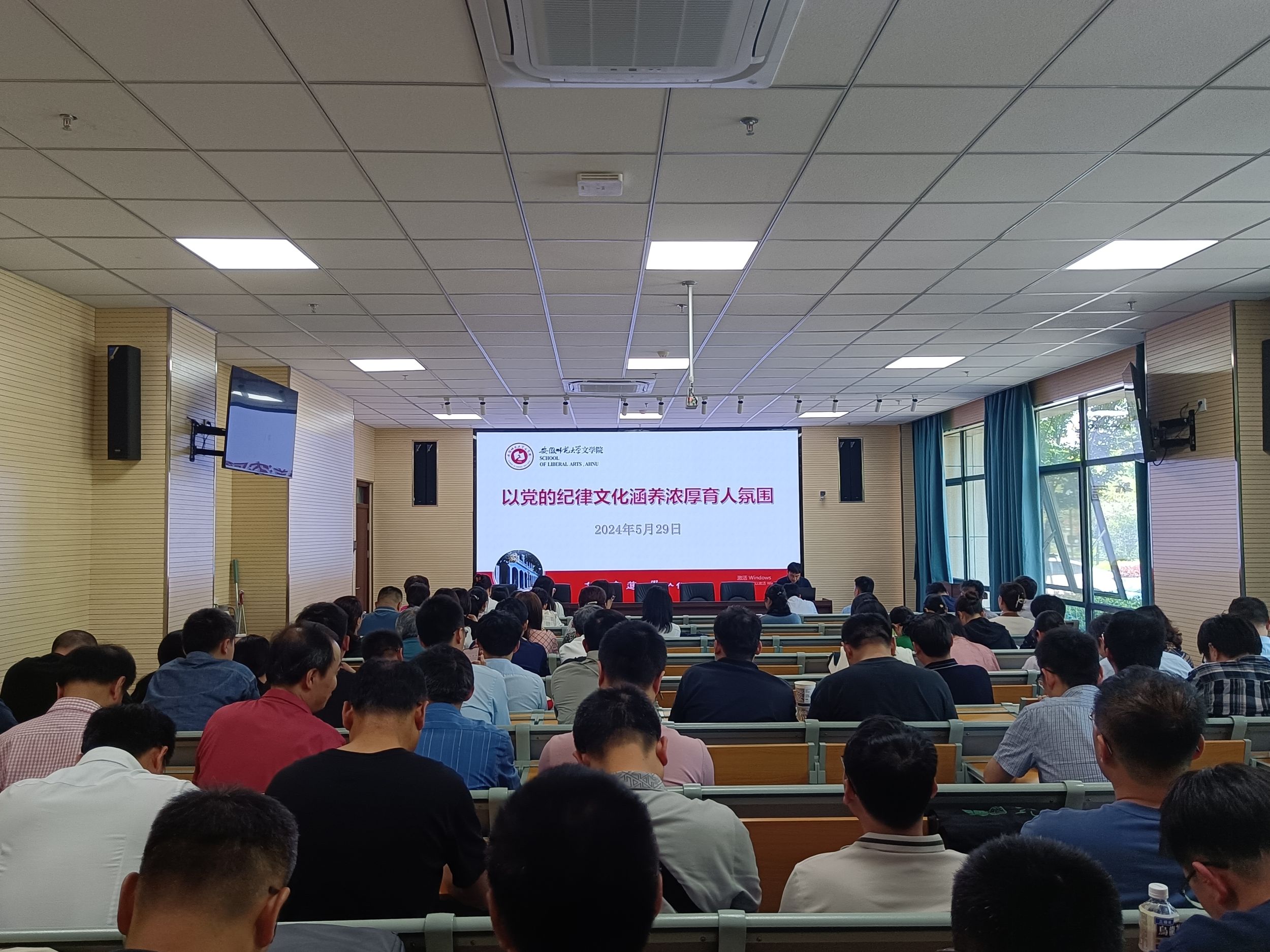 5月29日,必赢线路检测3003no1召开全体教职工大会暨政治理论学习会,扎实开展党纪学习教育和警示教育,学院党政领导班子成员、全体教职工参会。会议由党委副书记(主持党委工作)戴和圣主持。