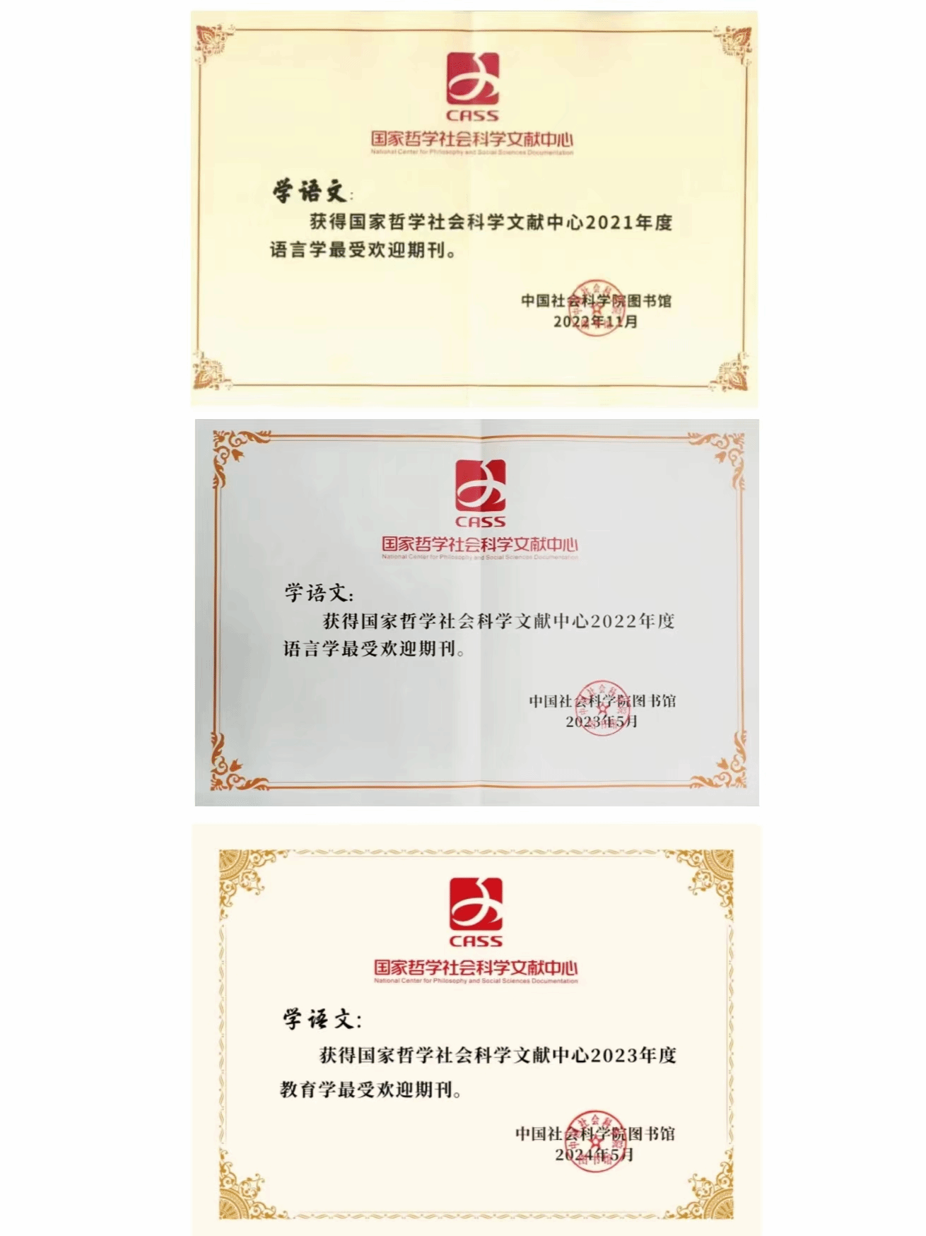 近年来,国家哲学社会科学文献中心每年发布《中文期刊用户关注度报告》,对哲学社会科学类24个学科的期刊用户关注度进行计算统计,并按照前10%的比例列出这些学科期刊的关注度指数。2021、2022、2023年,《学语文》均名列专业期刊前10%,连续三年获得“最受欢迎期刊”荣誉称号,也是唯一获得此项殊荣的语文教学类期刊。