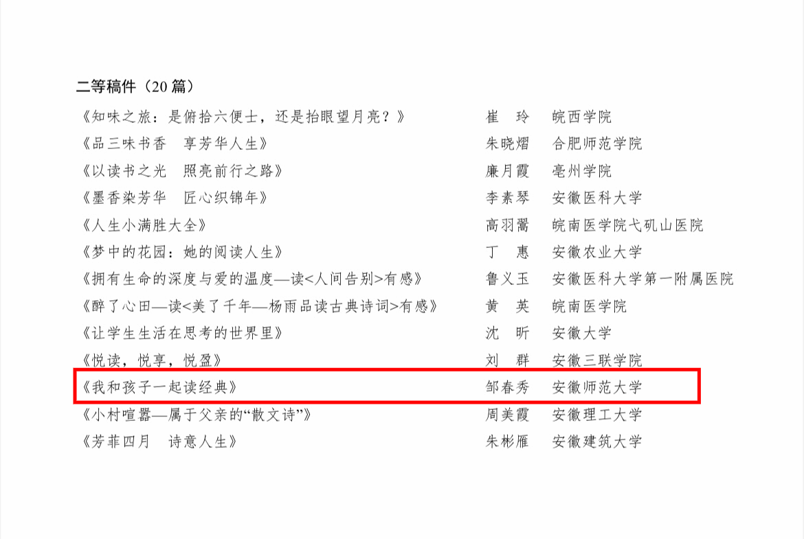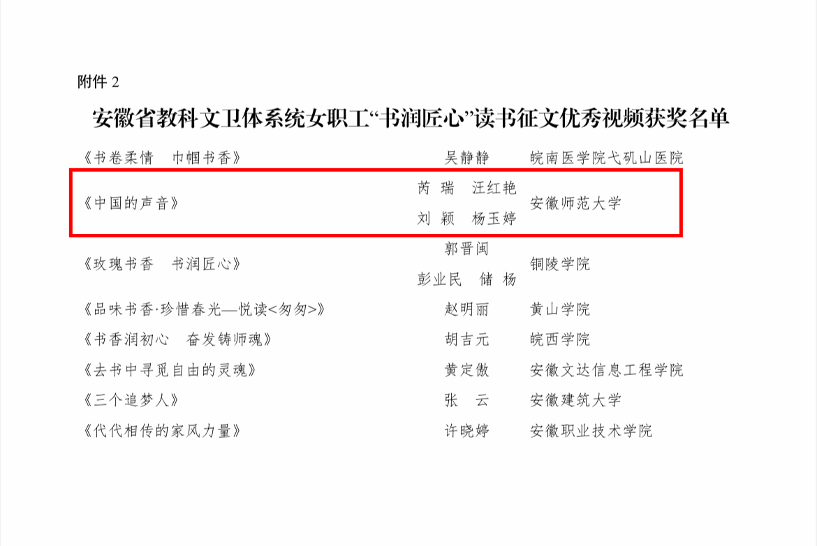 近日,安徽省教科文卫体工会举办的全省女职工“书润匠心”读书征文活动结果揭晓,必赢线路检测3003no1在此次活动中喜获佳绩,杨惠老师的作品《读<相信>,致蔡磊》荣获征文一等奖,邹春秀老师的作品《我和孩子一起读经典》荣获征文二等奖,芮瑞、汪红艳、刘颖、杨玉婷四位老师朗诵的作品《中国的声音》荣获优秀视频。