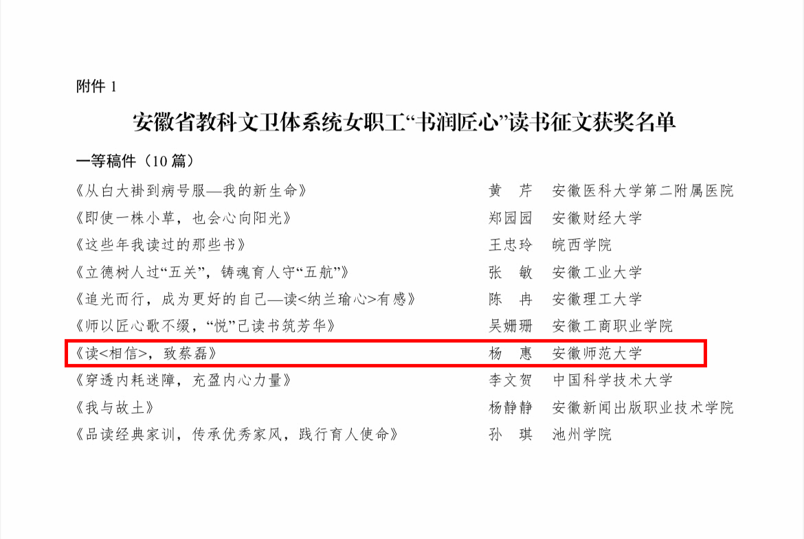 必赢线路检测3003no1在安徽省教科文卫体系统女职工“书润匠心”读书征文活动中喜获佳绩