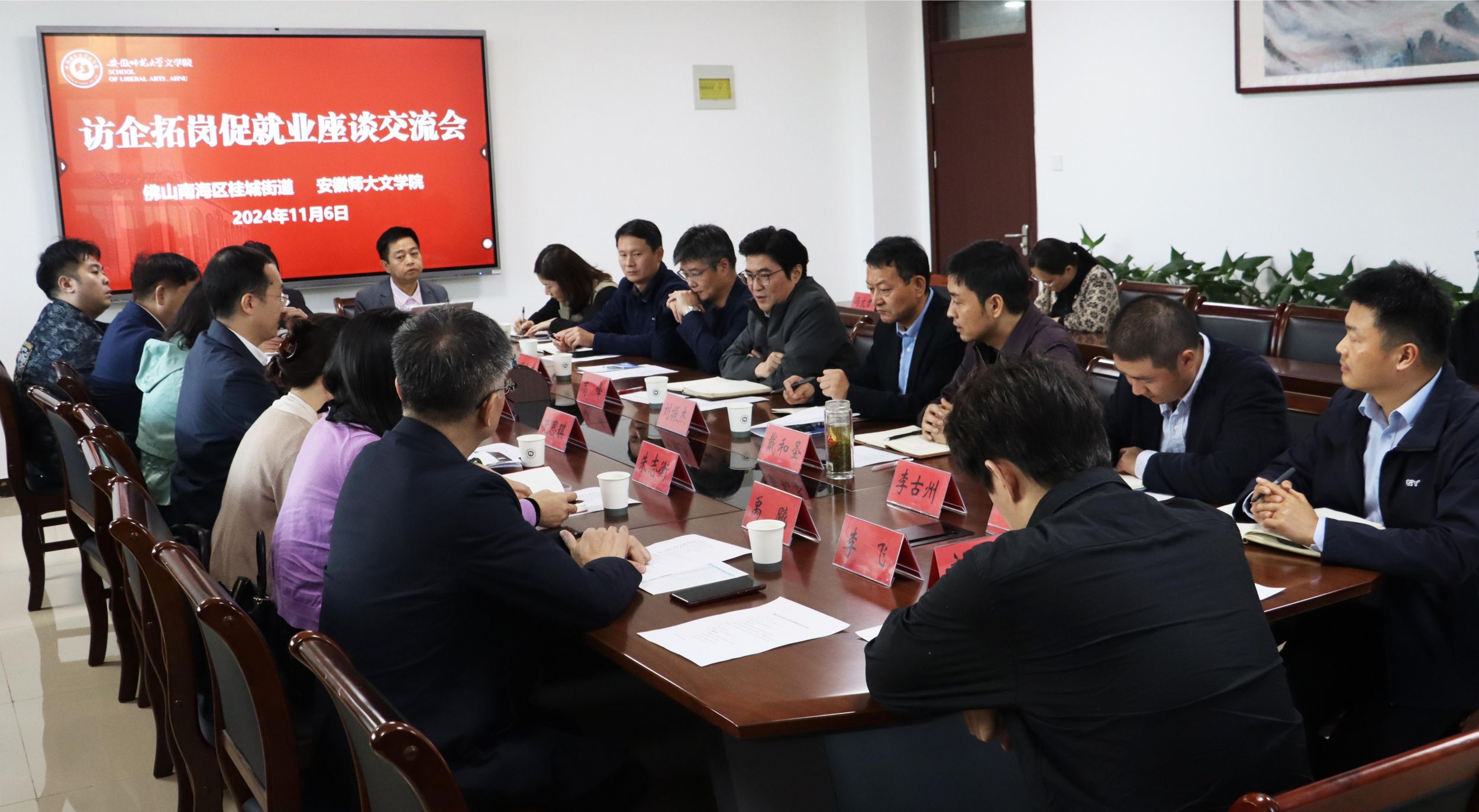 仰国林介绍了佛山市南海区的历史文化、经济发展和人才政策,并从“公园城市、教育强镇、人才乐园”三张名片对桂城街道的城市建设、基础教育办学情况进行详细推介。他对必赢线路检测3003人才培养质量给予高度评价,对学校为桂城街道持续输送了优秀毕业生表示感谢,希望借此机会与学校进一步加强合作。张丽霞介绍了西樵镇的文化氛围、师资待遇等,期待和学校共建大学生实习就业基地,达成长期的校地合作。几所中小学校长分别介绍了学校基本情况和用人需求,对我校毕业生在就业岗位上的优秀表现给予高度肯定,对师范生具备的扎实理论基础、优秀的教学技能和良好的发展潜力表示充分认可,希望安徽师大能够输出更多的优秀学子,形成“双向奔赴”的良好局面。