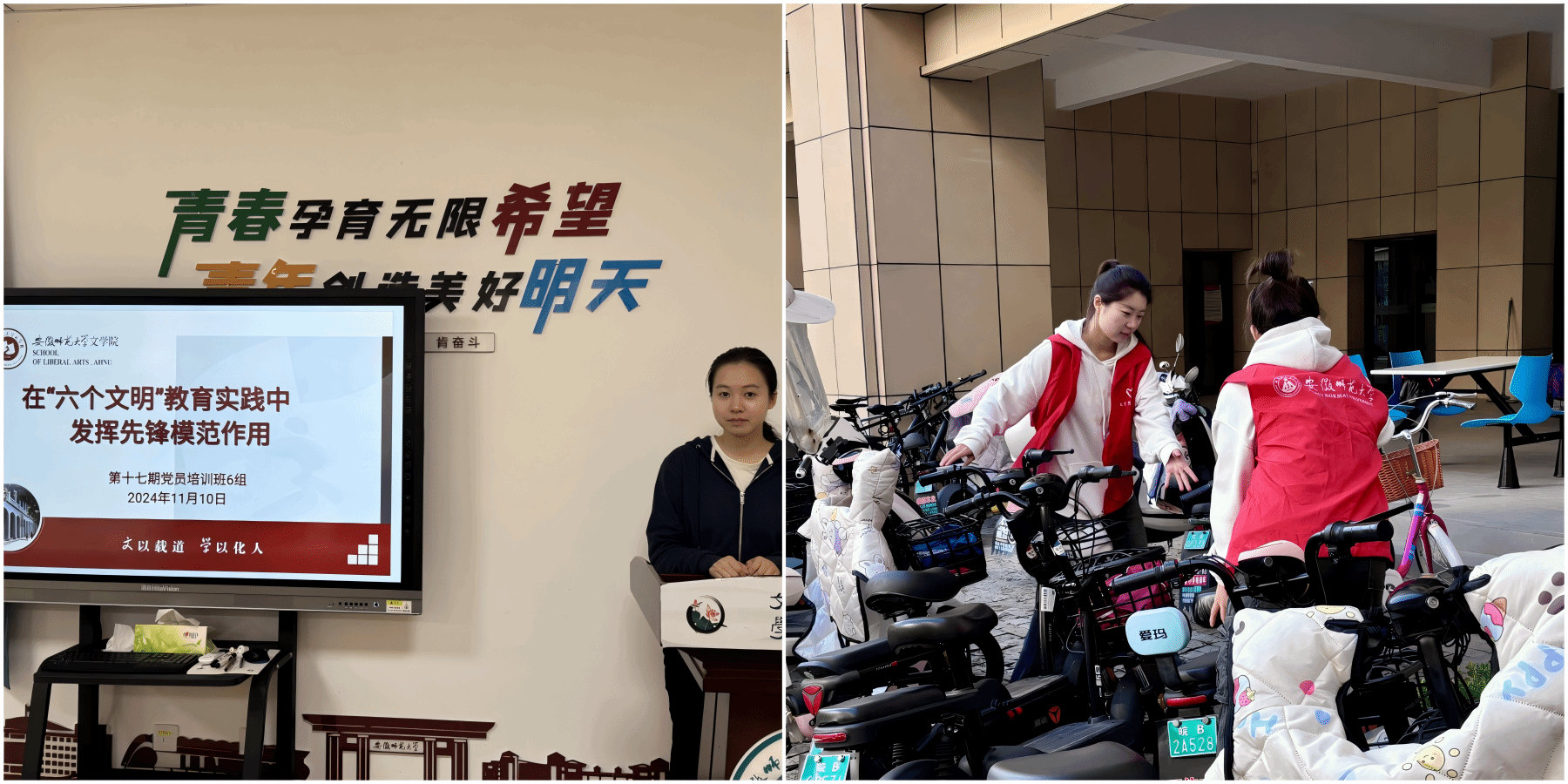 在理论教学的同时,培训班学员们还将理论与实践相结合,组织学员以小组为单位开展主题实践活动与研讨。各小组采取校内校外、线上线下相结合的方式,通过前往马鞍山含山县凌家滩遗址及黄山游击队旧址开展红色教育实践活动的实地参观调研,并以《如何在大学生“六个文明”教育实践中发挥先锋模范作用》为主题开展专题研讨,进行摆放单车、志愿服务、打扫卫生等实践活动。