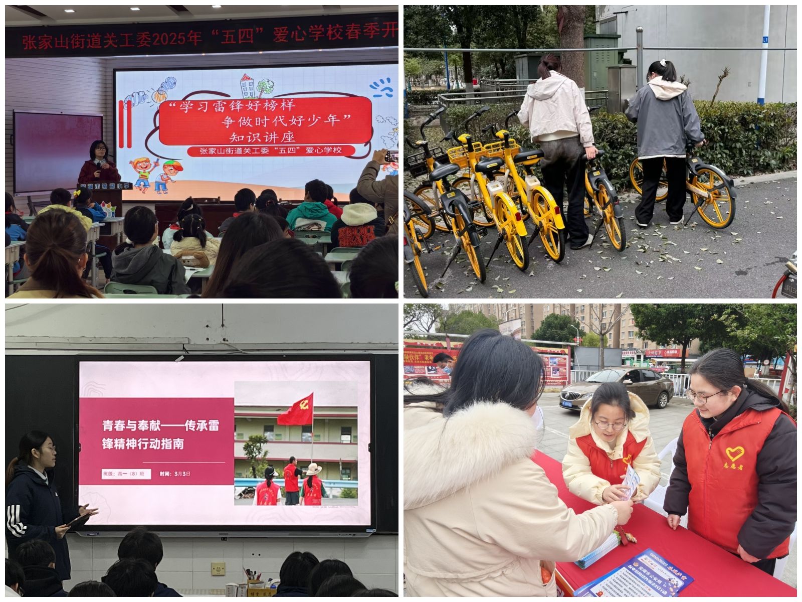 学院依托五四爱心学校,每周组织志愿者赴周边社区开展义务支教,开设国学诵读等课程,“学雷锋纪念日”期间创新开展了“种子计划”“我的雷锋承诺”等活动,让“学雷锋”成为浸润童心的习惯。在校园内,各班级对宿舍、责任教室,冬和园一站式学生社区等公共空间进行清扫,并组建“文明交通先锋队”,在校园主干道引导非机动车规范停放,助力构建和谐校园,扎实推进“六个文明”教育实践。在校外实习中,实习生将雷锋精神融入岗位实践,在和县二中策划开展“青春与奉献”主题班会,联合企业党、团支部在鸠兹社区开展公益宣讲,向社区居民介绍法律援助等知识。