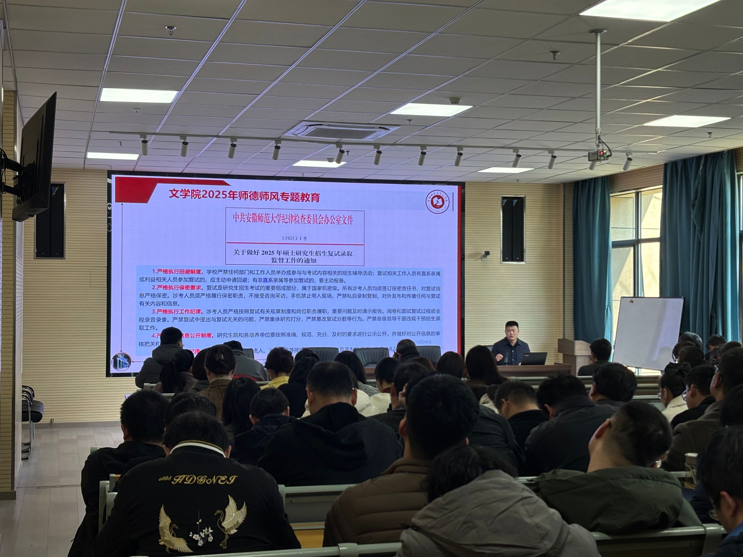 学院党委副书记、纪委书记刘飞作师德师风专题教育,他领学了《安徽省高等学校教师师德失范行为处理办法(试行)》《安徽省高等学校教师师德考核办法(试行)》等文件精神,传达了学校《关于做2025年硕士研究生招生复试录取监督工作的通知》,结合校内外师德失范案例,以案为鉴强化警示教育,随后就研究生复试工作、科研和财务等工作纪律强调了有关规定和要求。他表示,要坚决筑牢师德师风防线,进一步营造风清气正的育人环境。