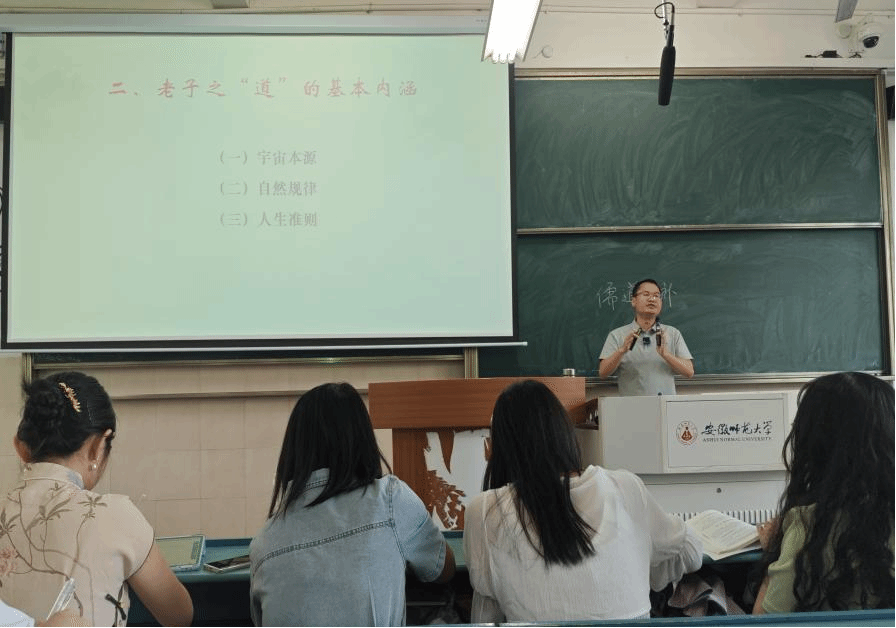 本次公开课的主题是“老子的思想”。黄老师首先通过图文结合的方式向同学们介绍了老子的大致生平。接着,他立足《老子》文本,从宇宙本源、自然规律和人生准则三个方面,带领同学们探究“道”的基本内涵。就宇宙论而言,“道”无形无状,是超感官的实在,是一切存在者的依据。它产生天地万物,是宇宙的本源。就自然规律而言,道遵循“反者道之动”的运行规律,呈现“自然而然”的状态。就人生准则而言,“无为而治”和“守柔处弱”是老子所提倡的处世策略。“无为而治”不是无所作为,而是强调主体对待外物保持因任自然的态度;“守柔处弱”则提倡人要像水一样善利万物而不争,从而促进整个社会的和谐发展。黄老师的讲解环环相扣,逐层推进,让同学们全面系统地了解了“道”的深刻含义。