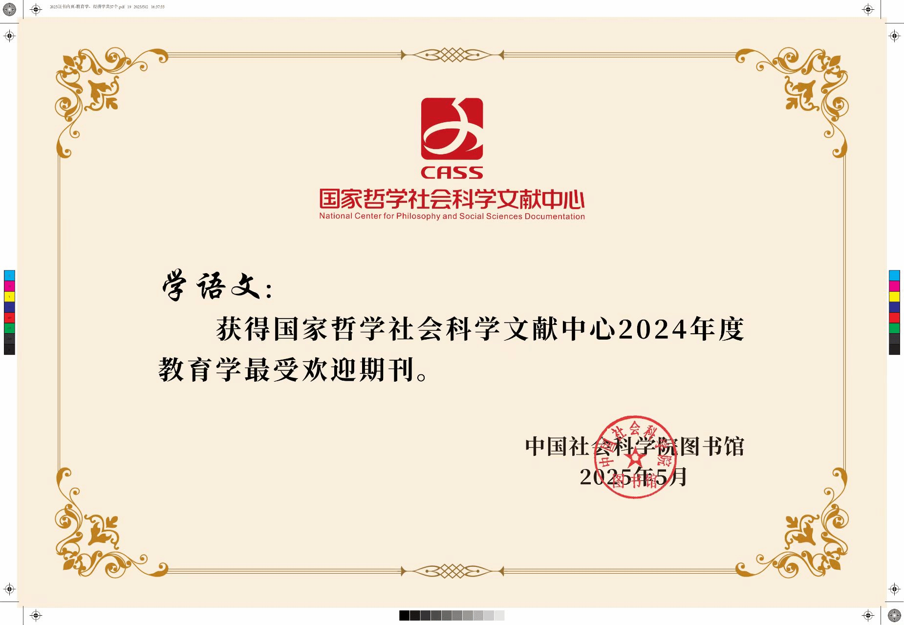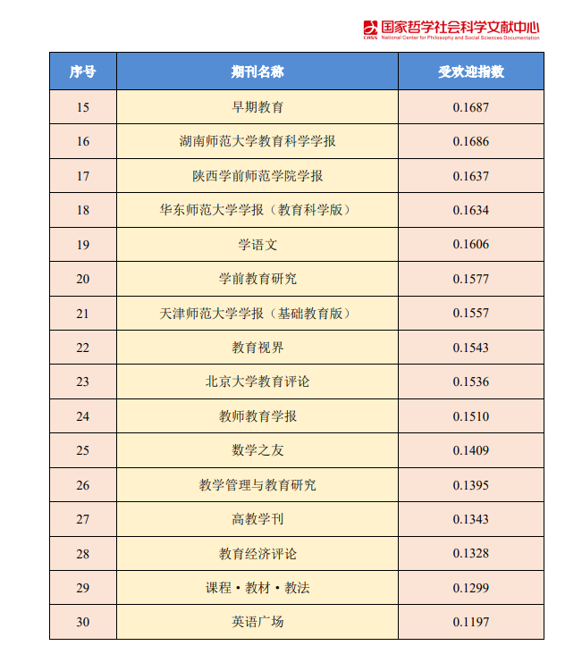 2025年5月16日,“学术期刊高质量发展研讨会暨国家哲学社会科学文献中心最受欢迎期刊报告发布会”在京举行。会上发布了《国家哲学社会科学文献中心最受欢迎期刊报告(2024年度)》《国家哲学社会科学文献中心用户使用分析报告(2024年度)》,对哲学社会科学24个学科门类2084种中文期刊的用户关注度进行计算统计,并按关注度指数排序,前10%为优秀期刊。在教育学共296种期刊中,《学语文》排名第19,列为“国家哲学社会科学文献中心2024年度最受欢迎期刊”。这是继2021、2022、2023年度之后,《学语文》第四次获得此项荣誉称号。