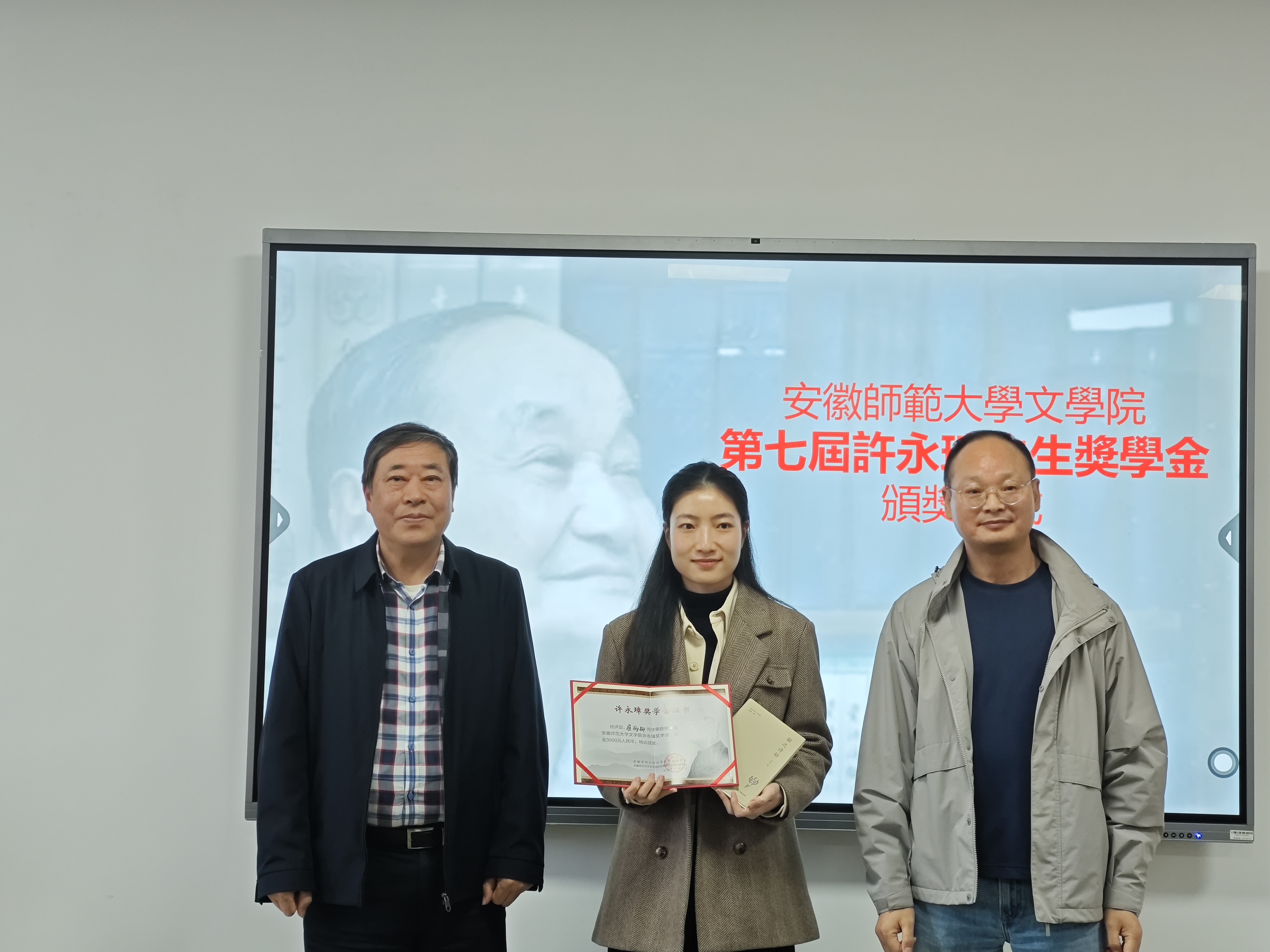 为弘扬许永璋先生学术成就与治学精神,激励我院研究生的学习与研究,许结教授自2018年起在我院设立“许永璋奖学金”,每年资助博士研究生、硕士研究生各一名,至今已累计颁发七次。本次奖学金的获得者分别为博士生崔杨柳、硕士生蔡乐。许结教授为获奖学生颁发荣誉证书,并勉励获奖者及在场师生勤学笃行、博观约取、厚积薄发。