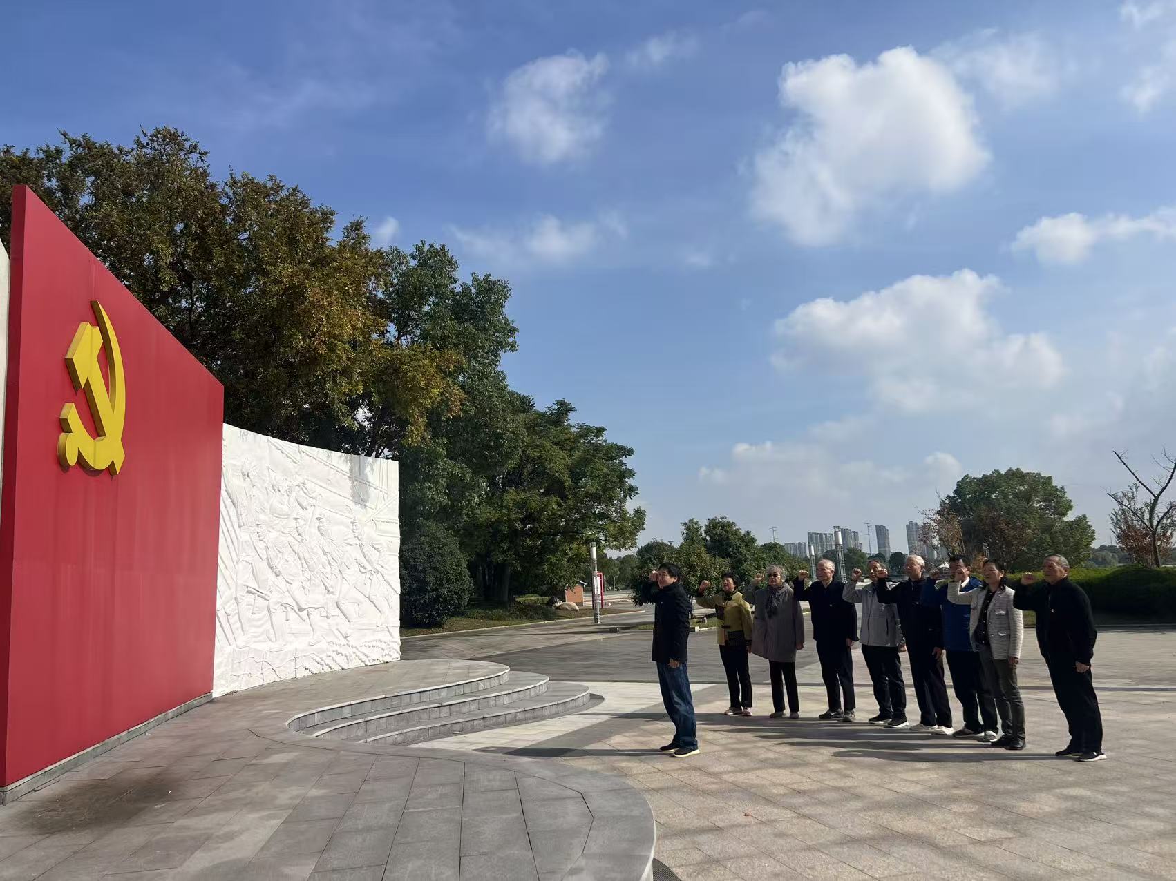 参观结束后,退休党支部书记张树文组织全体党员在纪念馆前庄严列队,重温入党誓词,老同志们深情回顾了与党同行的奋斗历程,表达了坚守初心跟党走、余热生辉献真情的赤诚之心,充分彰显了退休教师党员对党的深厚情怀。