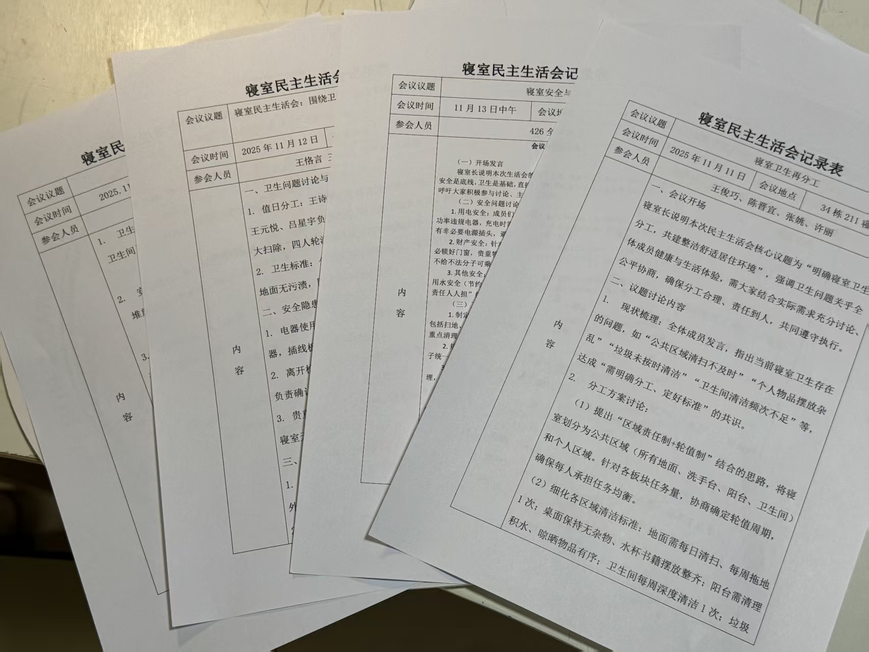 召开一次寝室民主生活会。各寝室围绕卫生标准、隐患排查、相处协调与责任分工等议题召开民主生活会,鼓励成员坦诚交流、提出建议,共同梳理问题并制定改进方案。会后填写电子记录表,明确责任分工与整改时限,推动议事成果落地见效。