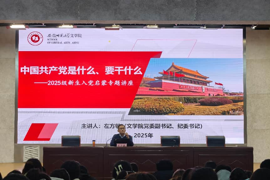 12月24日下午,在理科实训大楼报告厅,文学院党委副书记左方敏为2025级全体本科新生作了一场题为《中国共产党是什么、要干什么》的入党启蒙专题讲座。