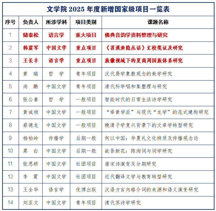 近期,全国哲学社会科学工作办公室公布了2025年国家社科基金后期资助等各类项目立项结果。至此,学院2025年新增国家级科研项目共14项,其中重大1项,重点2项,青年3项,一般5项,社团资助2项(我校首次),优博出版1项。中国文学学科年度立项数居全国同学科前列。