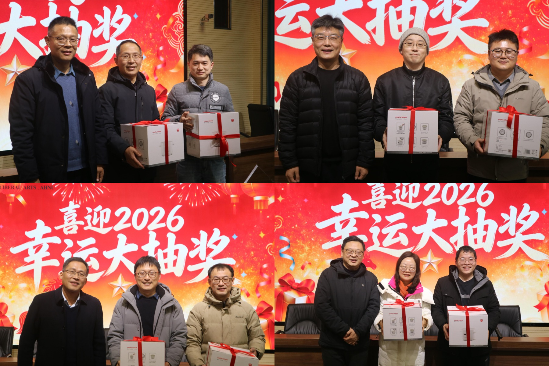 院长项念东代表班子简要回顾了2025年度工作,展望了2026年工作,并感谢全体教职工的辛勤付出。接着,现场进行了激动人心的抽奖活动,通过抽签产生了8位幸运奖,并颁发奖品,进行合影留念。