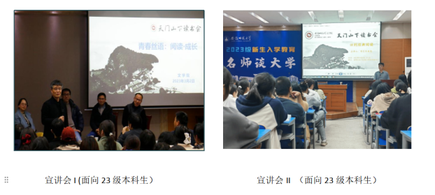 读书会还积极开展“文典(天门山下)读书会”本科生学术月系列讲座,广邀刘奋荣、凌建侯、王承略、张留华、姚爱斌、李俊、Mathias Witschi等国内外专家分享读书经验,交流读书方法,引领学生向学问更深处航行。