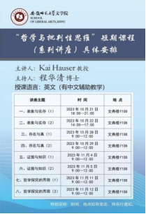 2023年10月下旬到11月中旬,必赢线路检测3003no1还特邀德国柏林工业大学的逻辑学家Kai Hauser教授为学院师生线下开设“哲学与批判性思维”全英文短期课程(八讲,32学时),“逻辑与哲学”读书会指导老师程华清博士全程辅助教学。课程为学生提供了足不出院就能直接体验海外名师线下授课风采的宝贵机会,极大开拓了学生的知识视野、激发了学生的探索兴趣。学生课后纷纷留言分享学习收获,表达对学院的感谢之情。