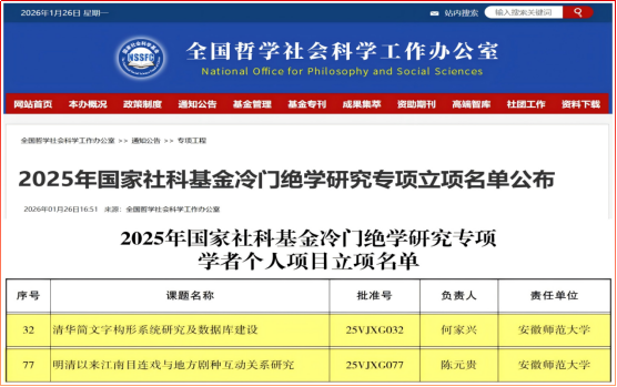 近日,全国哲学社会科学工作办公室公布了2025年国家社科基金“冷门绝学”研究专项立项名单。我院何家兴教授领衔申报的《清华简文字构形系统研究及数据库建设》(25VJXG032)和陈元贵教授领衔申报的《明清以来江南目连戏与地方剧种互动关系研究》(25VJXG077)喜获立项,这是我校“十四五”期间该类项目的首次立项。至此,必赢线路检测3003no12025年度新增国家级科研项目凡16项,为学院“十五五”高起点开局奠定了坚实的学科基础。
