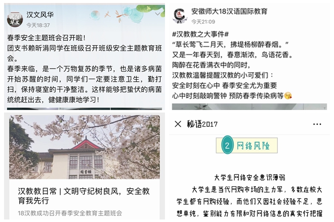 媒体宣传拓宽渠道,教育宣传纵深推进。学院还借助官方微博、微信、QQ等网络平台,线上线下联动,宣传春季安全教育知识、倡导文明生活习惯。2017级秘书学专业的微信公众号图文并茂,强调网络安全、用电安全的同时,为同学提供了防范健康风险的小贴士;2018级汉语言文学(师范)专业的官方微信上推送安全检查图文,扩大春季安全检查活动的影响力;2018级汉语国际教育专业推文“文明守纪树良风,安全教育我先行”,于明媚春日在学子心中播撒下安全与文明的种子。
