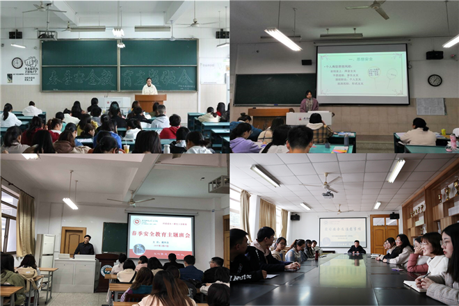 学院高度重视学生安全教育工作,学期伊始,学院即召开新学期思想政治工作务虚会,探讨了新学期学生思想及安全稳定工作。3月5日,学院又召开春季安全教育管理专题会议,院党委副书记戴和圣就新学期学生安全工作作了研判,要求各专业辅导员高度重视春季学生安全教育管理,防范化解风险。随后,各年级积极响应学院会议精神,以班级为单位,召开春季安全教育主题班会,就寝室安全、网络安全、心理安全、卫生安全、就业安全等进行主题教育。