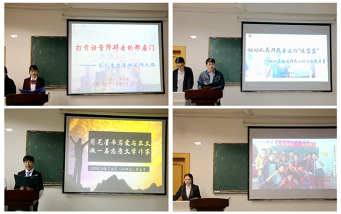 经过班级遴选,共有26名同学脱颖而出参加本次大赛。通过PPT展示与现场演讲的方式,参赛选手结合就业前景及自身性格分析确定职业目标,并制定出具体的职业规划方案。“我要让世界听见言语障碍儿童的梦想”,2017级汉语言文学(师范)专业的陈思敏志愿做一名儿童言语矫正师。她明确目标、知行合一,在努力学习儿童语音矫正知识的同时,通过团队实践走近孩子、深入孩子的心灵,用温暖去给予陪伴,用陪伴去创造可能。2017级卓越语文专业的陈曦在榜样力量的感召下,决心用青春去守护传统,用执着去传递信仰,做一名国学辅导教师。她在提升专业技能的同时,注重素质拓展,积极参加与“和”文化相关的活动,不断靠近梦想。2017级戏剧与影视文学专业的宋梦雨性格开朗,对待事情认真负责,家庭的原因促使她走上了儿童文学创作之路。结合专业特色,她积极参与话剧汇演、影评创作及稿件撰写,同时跟随支教团队去深入了解孩子的想法,为儿童文学创作积累经验。2018级卓越语文专业的叶洳飒志愿做一名新时代下的中学语文教师,通过夯实专业基础、磨炼师范生技能、投入学生工作、参与各类文学创作大赛,用实力为自己的梦想铺垫。