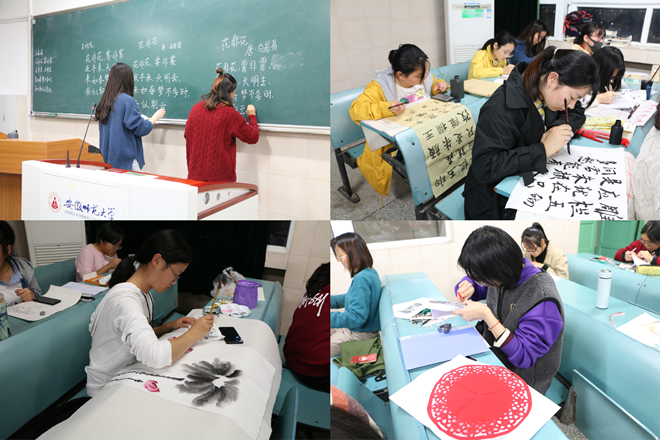 本次比赛分为书法组与绘画组。粉笔字比赛内容为书写白居易的《花非花》,钢笔字和毛笔字比赛内容为书写李煜的《虞美人》后四句,要求页面整洁,书写规范,具有中国书法美。大赛现场,参赛选手坐姿端正,神情专注,用心书写每一个字符、笔画。他们的作品或苍劲有力,或隽永飘逸,或清秀雅致,充分体现了同学们过硬的书写基本功。绘画组分为绘画和剪纸两种创作类型,以“师大印象”为主题,要求作品美观大方,展现师大风采。大赛现场,进行绘画的选手聚精会神,画笔下的师大令人惊叹,银杏树下的小猫栩栩如生,花津湖畔的天鹅追逐嬉戏。选择剪纸创作的选手们也不落其后,从一笔笔地描绘到一刀刀地裁剪,展现了选手眼中不同的师大风韵。