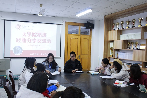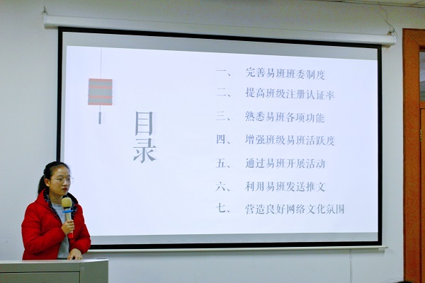会议伊始,祝福老师向大家介绍了易班及本院工作站的性质。他指出,本次交流会的主要目的是了解各班级易班建设现状,为接下来的易班建设工作提供新思路、新方法。随后,站长朱倩雯从易班相关功能、本院易班工作站情况、近期活动总结三个方面进行介绍,强调在探索新功能的同时,应注重打造班级特色,展现班级风采。会上,2018级卓越语文教师实验班、2018级汉语言文学(非师范)专业的易班班委代表分别就本班级建设情况向大家进行了经验分享。18级卓语冯莹就提升注册认证率、熟悉易班各项功能、增强推文板块建设及营造良好网络氛围等七个方面与大家进行交流,重点说明了建设过程中团结协作、建立制度的重要性。18级汉非吴跃然以本班易班建设的实际过程为例,从易班班委分工合作、线上线下联动发展、时刻关注易班动态、建设中的经验体会四个方面,提出结合班级实际情况制定个性化建设方案的新思路。