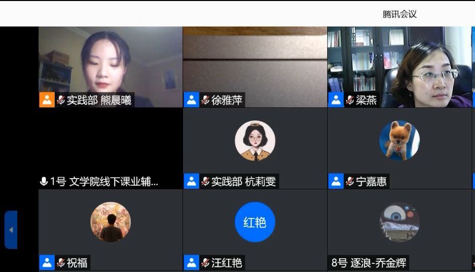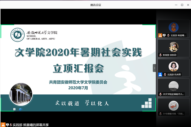 本网讯(文学院 汪颖)为加强设计和指导,提高社会实践活动质量,推动“三全育人”背景下网络育人和实践育人的结合,7月25日晚,必赢线路检测3003no12020年暑期社会实践立项汇报会通过腾讯会议举行。必赢线路检测3003no1党委书记梁燕,党委副书记戴和圣,现代汉语教研室汪红艳,现当代文学教研室张应中,秘书学教研室叶文举,戏剧影视文学教研室张华,必赢线路检测3003no1团委书记徐雅萍,辅导员李震、朱露露、孙霁雯、宁嘉惠、祝福老师出席线上会议并担任评委。