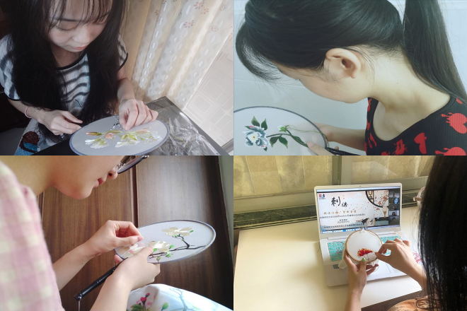 “汉语桥协会成立已有十多年,吸引更多的大学生了解、学习和传承传统文化是协会一直在做的事情。虽然今年情况特殊,但我们也要坚持做下去。”汉语桥刺绣团队队长陈燕清这样告诉记者。据了解,团队以耳熟能详的古代文学经典《红楼梦》为基,将书籍中“十二金钗”各自对应的花种作为线上刺绣活动的内容。8月4日,团队还邀请甘肃非物质文化刺绣传承人丁永莲老师线上指导答疑。由于刺绣创作环节复杂,每名同学在此前都做了充分的准备,在制作的过程时保持着严谨的匠人精神,对于每一针都谨慎细微。制作的过程中,丁老师也会经常和队员们交流,解决队员们遇到的难题。此外,团队成员还将自己所学技术利用云课堂的方式传授给他人。