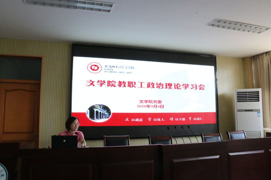 梁燕传达了校党委理论学习中心组(扩大)学习会精神,领学了教育部等七部门《关于加强和改进新时代师德师风建设的意见》等文件,并结合上学期末“风里雨里——老师等你”党员示范岗、暑期退休老教师走访等活动,分享了我院师德师风典型事例,号召全体教职工争当“四有好老师”、争做“四个引路人”。副院长俞晓红就新学期教育教学、学生考试等有关工作进行了详细安排。储泰松带领大家回顾暑期工作,并布置安排了新学期重点任务,强调本学期学科学位点建设、专业建设、十四五规划,承办国家语委、省语委等重点任务,希望全院教职工齐心协力,共同做好疫情防控常态化背景下人才培养、必赢国际、社会服务、文化传承与创新等各项工作。