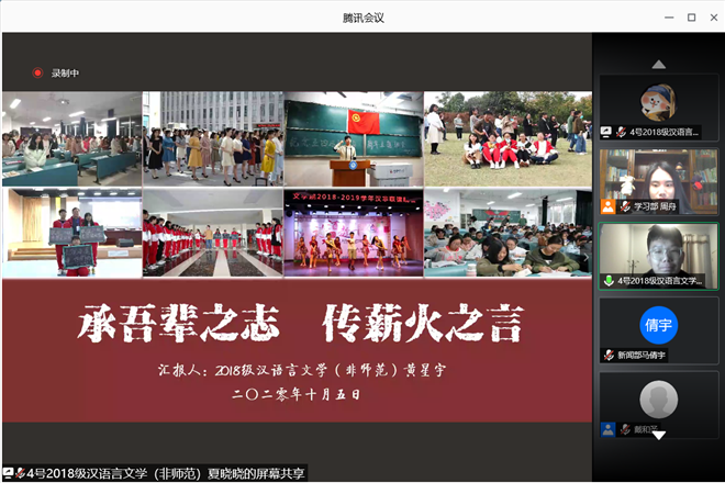 参评的15个班级借助PPT演示的方式,从班级规章制度、学习成果、素拓活动、品牌特色等方面,展示了团结友爱、奋发向上的集体群像。18级汉语言文学(非师范)专业的同学们将一起走过的岁月制成了一本“书”,一帧一页间都传递出他们薪火不灭之志,他们做好基础建设固本培元,同时综合发展,在各方面均收获颇丰;19级卓越语文教师专业的同学们积极参加团日活动,制定严格规章制度,在多彩的课外活动中也获得了多个奖项;19级秘书学一班的同学们携青春之气在班集体建设中发光发热,他们投身志愿工作,组织班级活动,全面发展自己。