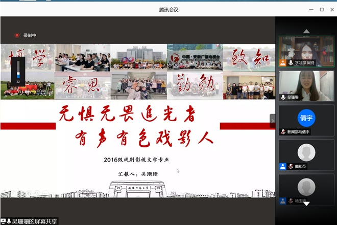 评选汇报后,2018-2019学年校十佳班集体代表、16级戏剧影视文学专业班长吴珊珊同学带来了经验分享,他们在一次次活动中成长,努力走在行业前沿,为同学们展现了优秀班集体的作风,鼓舞了更多同学努力建设团结向上的优秀班集体。