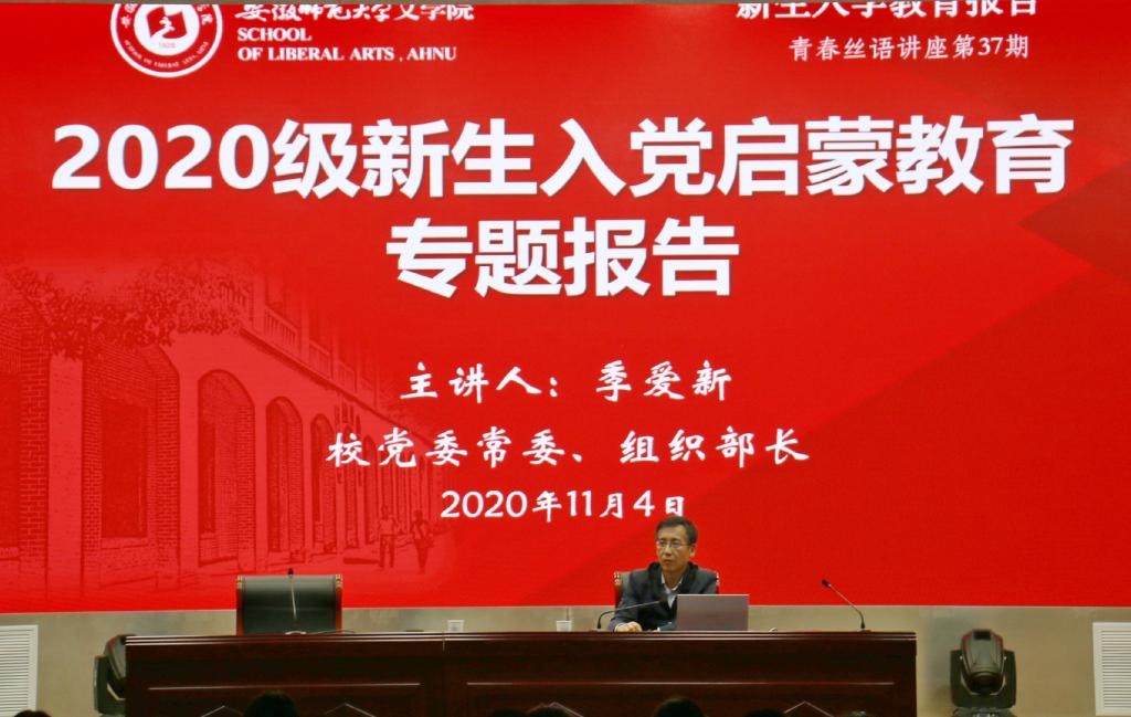 本网讯(必赢线路检测3003no1 江静薇 宁嘉惠) 11月4日晚,必赢线路检测3003no1“青春丝语”系列讲座第37期在花津校区理科大楼报告厅开讲。校党委常委、组织部部长季爱新为必赢线路检测3003no12020级新生作入党启蒙教育专题报告。必赢线路检测3003no1党委书记梁燕、副书记戴和圣,必赢线路检测3003no1团委书记徐雅萍、本科生辅导员代表及2020级全体新生聆听报告。报告会由梁燕主持。