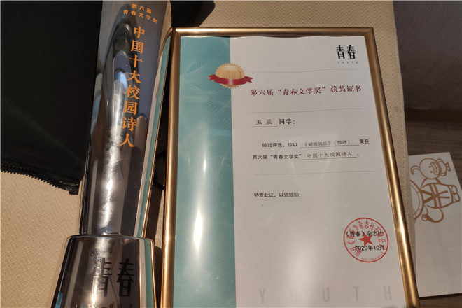 据了解,这已经不是王亚同学第一次获得全国性的诗歌奖项,此前王亚同学以“叶可食”为笔名曾获第三十五届武汉大学樱花诗歌奖、第六届南京大学重唱诗歌奖、第十届中国校园双十佳诗歌奖、四月诗会·第三届全国大学生诗歌节三等奖等众多奖项,有作品见于《青春》《中国诗歌》《诗歌月刊》《散文诗世界》等刊物,入选第二届长三角新青年改稿会。