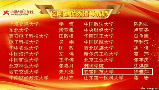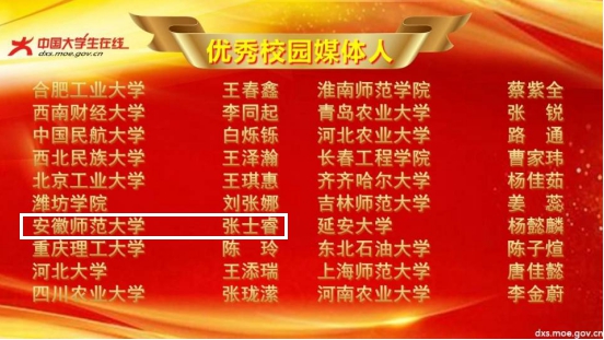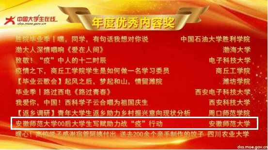 本次评选中,安徽师大校网通站获评全国“优秀校网通站”、2020年全国大学生暑期社会实践成果征集展示活动“突出贡献奖”。通讯站指导老师徐雅萍获评“校网通优秀指导教师”,张士睿同学荣获“优秀校园媒体人”称号。原创文章《战“疫”里的安徽青年:青年学子同上一堂“云端”思政课》获评“年度十佳内容奖”,《必赢线路检测300300后大学生写赋助力战“疫”行动》获评“年度优秀内容奖”。