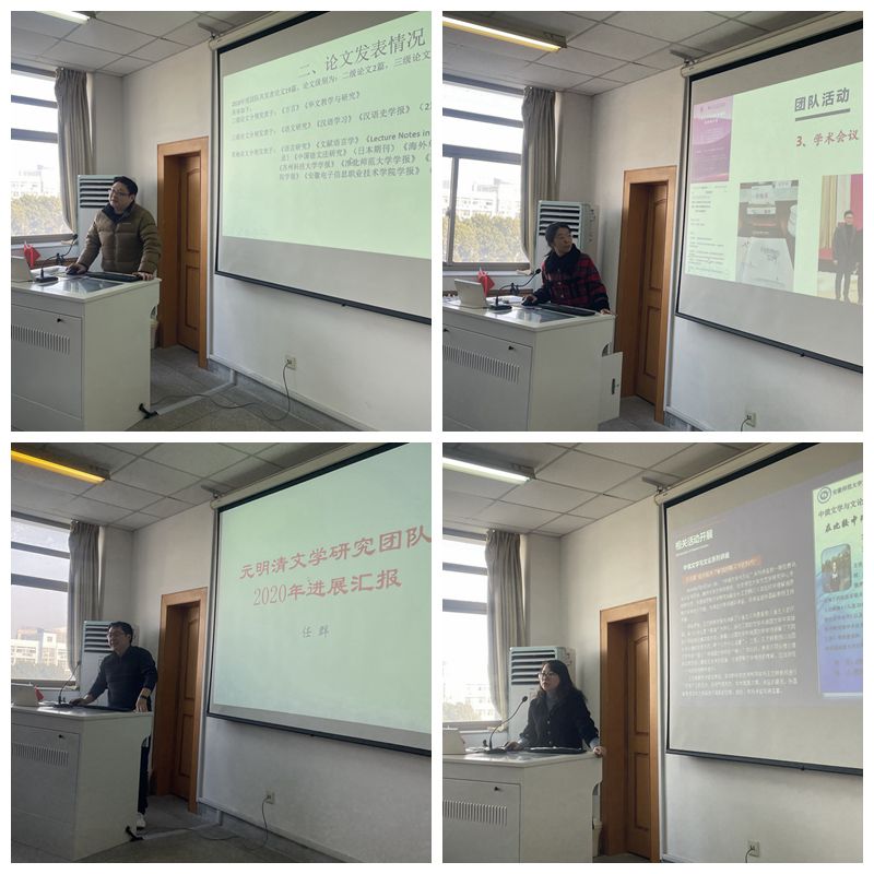 学院10个科研创新团队先后汇报。各团队负责人分别就本年度团队学术成果、沙龙活动情况及存在问题、科研项目培育,以及团队建设改进措施与2021年工作计划做了认真汇报。各团队围绕各自建设目标集中展示了研究特色与学术规划,汇报内容目标明确、重点突出、成果丰富,既盘点了年度建设成效,又总结了经验、反思了不足。尤其值得一提的是,团队负责人精准自我把脉,清醒地意识到建设过程中遇到的难题和“瓶颈”,并积极思考解决问题的方法与途径,提出了诸多建设性意见。团队汇报之后,安徽语言资源保护与研究、辞赋艺术研究、传统文化与佛典研究、朱光潜暨皖籍现代美学家研究等4个研究中心的负责人分别汇报了各自本年度主要工作、2021年工作计划与中长期发展规划。