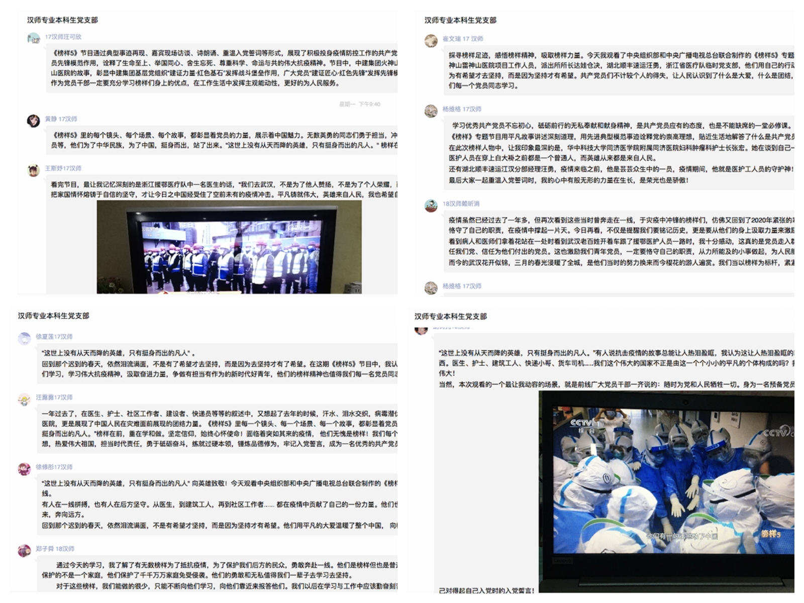 17汉师赵阳阳:作为一名新生的青年党员,在疫情抗战当中我真正意识到榜样的重要性。大会上所提到的这一系列医护工作者,他们奉献自己的青春与生命,在危险的疫情区当中,为着人民的生命与健康做着殊死的奋斗。在这样的榜样面前,我意识到我们作为一名党员所应该拥有的使命感和责任感。