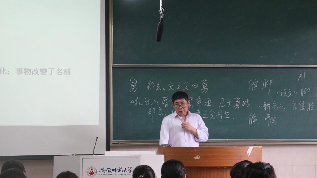 温志权老师讲授的内容是“古书的注解”。温老师以提问的方式导入新课:为何要阅读古注?在总结和概括学生回答的基础上,引导学生思考古注产生的原因。古注产生的原因根本在于语言的发展变化,以及文献中的时风事易、历史事件、典章制度、风尚习俗等不为后人所理解的诸多其他因素。在与学生的讨论过程中,温老师旁征博引,例举了诸多学者对于此问题的观点,例如“训诂起于语言之变”(洪诚),通过板书展示了同一个字在不同注解中的不同情况,如“脚”这个字,《说文》释“脚,胫也”,而《释名》释“续胫也”,指出同一作者对同一个字的注解在不同古书中也不完全相同,例如,“舅”,郑玄有注“夫之父曰舅”,也有注“舅姑,妻之父母”。学生直观感受了古注的特点之后,温老师将重点放在引导学生梳理古注的发展历史。宏观上区分古注的不同发展阶段,微观上引导学生找出对应时期的经典古注之例,将古注发展划分出五个大的阶段——萌生于先秦;兴盛于两汉;拓展于魏晋南北朝、推进于唐五代;变革于宋元明;大兴于清代。最后,温老师提醒学生既要掌握古注发展的几个阶段,又要了解每一阶段的经典实例及其特点,做到理论和实例相结合,全面掌握该知识点。