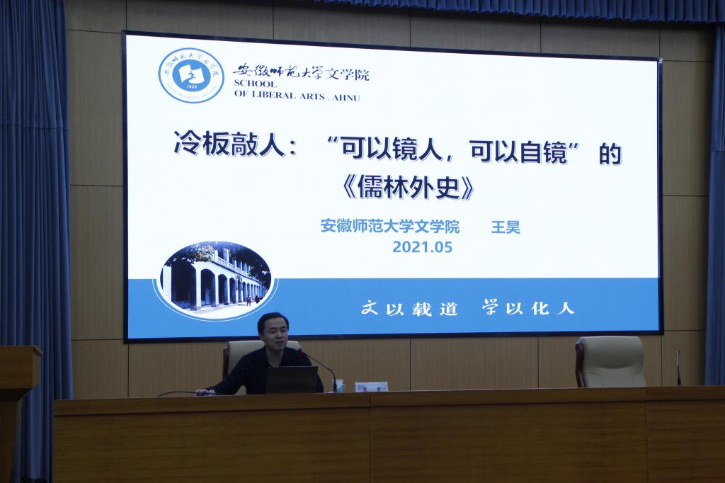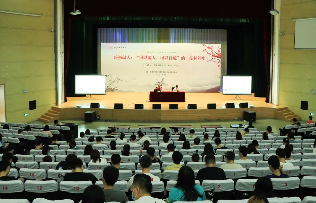 5月26日至27日,合肥工业大学“斛兵文化大讲堂”第二十一期报告会在屯溪路校区学术会议中心大报告厅和宣城校区大学生活动中心大礼堂先后举行。我院教授、博士生导师王昊应邀作题为《冷板敲人:“可以镜人,可以自镜”的〈儒林外史〉》的报告。