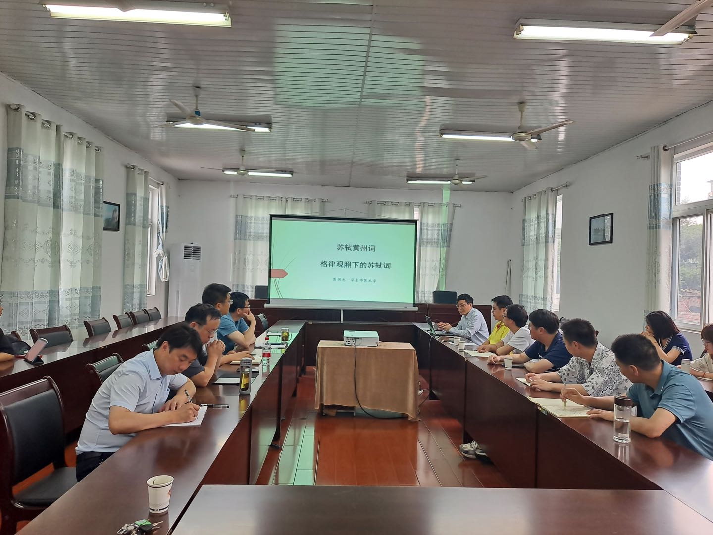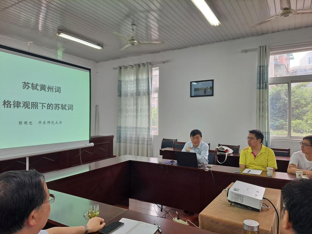 然后,彭老师从三个角度从格律观的角度分析了东坡词。首先,他提出东坡词严合格律的观点,打破了对苏轼因才气大而为“曲子套不住者”的一贯认知。他举例说“墙头红杏暗如倾”中“暗如倾”三字颇不好解,各家注本也莫衷一是,但排比《浪淘沙》词作可知,此处实为“如暗倾”之倒,乃是东坡为合律而颠倒了字序。又如,《定风波》中首句“莫听穿林打叶声”,“听”字常人都读平声,意为听见之意。实际上,按格律“听”当作去声,作“听凭”解。其次,彭老师指出苏词在创调方面的贡献,据不完全统计就有24首,如《华清引》就为东坡自创。其中也不乏因苏轼词句而改调名的现象,如《贺新郎》一词,因首句“乳燕飞华屋”,故又名《乳燕飞》。最后,彭老师指出苏轼黄州词具有广大精微的特点,其广大处在内容无所不包,其精微处在词中经典的运用,在故意藏头省略,目的也还是为了合律。通过彭老师的讲解,大家认识到苏东坡不仅热爱歌词的创作,而且能够严守格律。这一结论打破了传统对东坡词的认知。